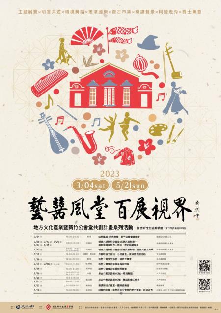 國立新竹生活美學館辦理「藝囍風堂‧百展視界」地方文化產業暨新竹公會堂共創計畫系列活動,將於3月4日(六)至5月21日(日)期間,在國立新竹生活美學館(地址:新竹市武昌街110號)舉辦,由新竹市美術協會、巫婆戲劇魔法故事屋、人尹合作社、喧嘩股份有限公司、玉米雞劇團、樵樂雅集、社團法人新竹市竹塹社教服務協會、歡喜爵士樂團等8個藝文團隊,經過層層公開徵件及增能輔導後,齊聚新竹公會堂辦理36場藝文活動及為期3週的特展,有主題展覽、明盲共遊、環境舞蹈、搖滾國樂、復古市集、樂讀聲景、阿嬤走秀、爵士舞會等多元類型,歡迎民眾踴躍參加。