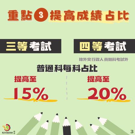 修正重點③:三等考試普通科目每科占比提高為15%,四等考試除外交行政人員類科外,普通科目每科占比提高為20%。