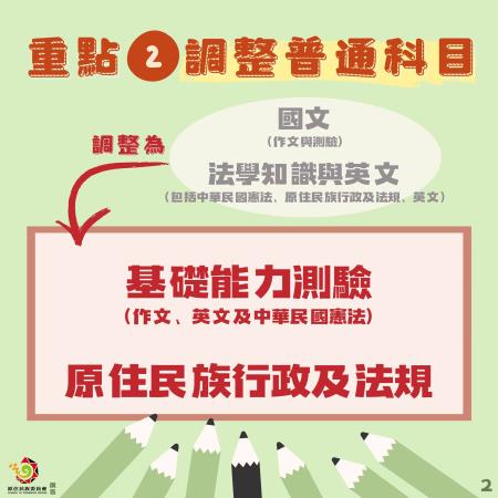 修正重點②:調整三等及四等考試普通科目內涵,將「國文(作文與測驗)」、「法學知識與英文(包括中華民國憲法、原住民族行政及法規、英文)」2科,調整為「基礎能力測驗(作文、英文及中華民國憲法)」及「原住民族行政及法規」2科。