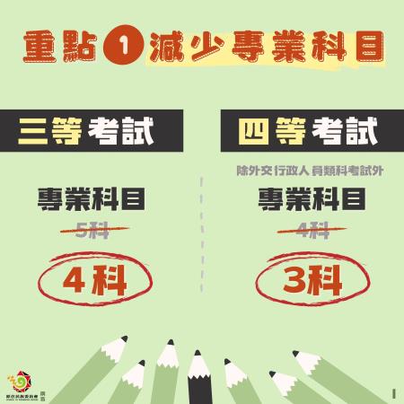 修正重點①:修正三等及四等考試,應試各類科專業科目均減列1科(除四等外交行政人員類科外)。
