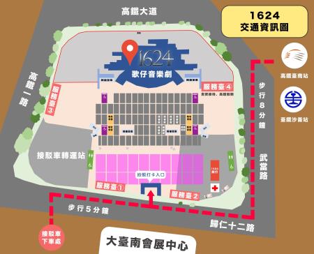 文化部表示,《1624》呈現臺灣海域船來船往,準備一同穿越時空的民眾,也有多種交通方式可以快速抵達演出現場。因預期將有大量民眾湧入,高鐵周邊將實施交通管制,不過自行開車的民眾也不用煩惱,現場新闢了「高發二路免費臨時汽車停車場」,步行約15分鐘可抵達會場;也推薦大家搭乘輕鬆免等待的臺鐵與高鐵,臺鐵沙崙站前站出口,步行約8分鐘即可抵達;高鐵臺南站 2 號出口,步行約8分鐘即可抵達;民眾亦可選擇搭乘免費接駁車,下車後步行約5分鐘即可抵達。