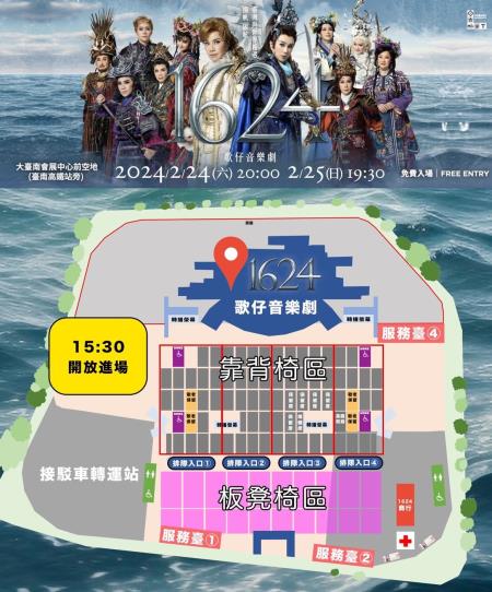 《1624》歌仔音樂劇免費、免票入場,每日15:30開放排隊入場,分4個入口排隊。現場亦規劃敬老席與愛心席,65歲以上年長者、身障人士可由1位陪同者一同進場,請攜帶相關身分證明入座。呼籲民眾注意自身安全,切勿搭帳、夜排,也請遵守官方公佈的注意事項,共同打造愉快又安全的看戲氛圍。