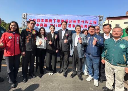 今日通車典禮出席的貴賓,包括內政部長林右昌、新竹縣長楊文科、新竹市長高虹安、立委林思銘、 新竹縣寶山鄉長邱振瑋、竹東鎮長郭遠彰、新竹縣議員林昭錡、黃豪杰、楊德昌及邱坤桶、新竹科學園區管理局長王永壯、國土管理署長吳欣修、國土管理署北區都市基礎工程分署長曾正宗、竹東鎮頭重里長曾俊傑、竹東鎮柯湖里長呂建宏、新竹市金山里長饒彬義、地方民意代表、居民等共同參與。