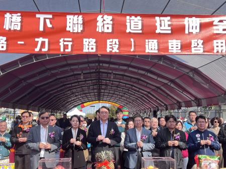 林右昌說明,「新竹縣高鐵橋下聯絡道延伸至竹科工程」是新竹科學園區外圍少數跨越南北的道路,工程第1期(興隆路至公道五段)及第2期(公道五至中興路段)已分別於104年7月與108年8月通車,今日通車的第3期(中興路至力行路段) 全長約1.3公里,總工程費約12.12億元,中央補助約10.45億元、86%,平面道路段長約699公尺、跨越柯子湖溪高架橋梁段長約601公尺、路寬30公尺,採雙向各二快一混合車道及人行道配置,可直接從新竹科學園區另一側進入,達到車道分流避開慈雲路及介壽路的龐大車流量,不僅節省用路人時間,也提供行人友善動線及車輛行進空間。