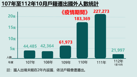 內政部指出,110及111年因疫情因素,國人出境未能在 2 年內返國,依法戶籍會遭遷出,因此人數分別增至18萬及 22 萬餘人。這些人口原本就在國外,因為疫情因素選擇暫時不入境,後因國境逐步解封,國人陸續返國,截至今(112)年10月底止,戶籍遭遷出人數已下降為2萬1,997人。