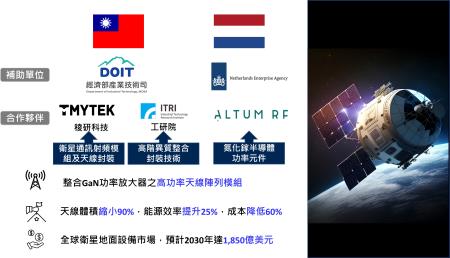 在新創方面,我國廠商稜研科技與荷商Altum RF新創公司的合作亦為徵案成果亮點之一。稜研是5G/B5G 與衛星通訊應用技術的創新者,提供衛星天線設計、製造到測試的一站式解決方案;Altum RF長期專注發展化合物半導體功率元件,透過稜研科技的衛星通訊射頻模組及天線封裝能力,聯手Altum RF之氮化鎵功率晶片,開發出小體積(縮小90%)、輕量(減輕70%)、低成本(下降60%)之高效能氮化鎵功率放大器天線模組,可提早布局低軌衛星通訊系統市場。依據美國衛星產業協會(SIA)預估2030年全球衛星地面設備市場規模將達1,850億美元,本合作案預期可帶動臺荷雙邊高頻材料、化合物半導體製造及封裝等產業鏈發展,也獲得經濟部與荷蘭政府的大力支持。