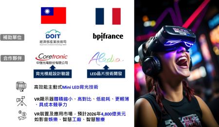 產業技術司於今(2023)年最新與法國政府通過資助我國中強光電與法商ALEDIA攜手投入高階顯示應用裝置開發。中強光電是全球領導液晶面板之背光模組製造商,為友達、群創、三星、LG等國際面板大廠長期合作夥伴;ALEDIA為法國最大研究機構CEA之衍生新創,專注於LED晶片技術開發並擁有多項專利,透過臺法研發合作,共同研發更輕薄、高明暗度對比、低能耗且具成本競爭力之Mini LED背光模組,將可提供VR裝置所需之關鍵零組件。VR裝置及應用已成為全球顯示器新興市場,預估2026年市場規模將達4,800億美元,此合作所研發之Mini LED背光模組,未來預期可進一步結合我國顯示器面板技術優勢(如群創、友達),提供具效能及成本優勢的VR顯示產品,跨足如影音娛樂、智慧工廠、智慧醫療等應用,展現臺法在光電及半導體領域互補優勢。