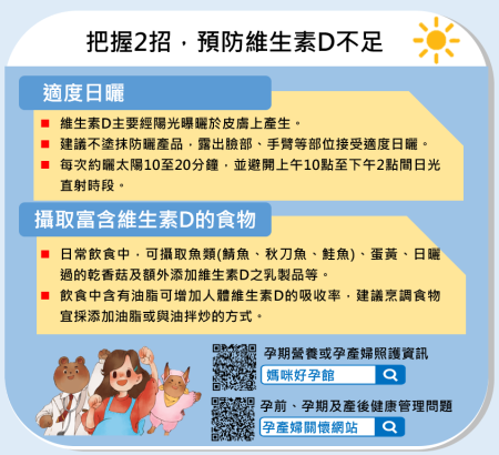 日曬及飲食是補充維生素D的不二法門,若在日常生活有攝取不足情形,必要時可諮詢營養師進行飲食評估,以改善個人的飲食習慣,或在醫師處方指導下,補充孕婦專用的營養補充品。準爸媽們如有孕期營養或孕期照護問題,可至國民健康署健康九九+網站-媽咪好孕館(https://health99.hpa.gov.tw/theme/5),或孕產婦關懷網站,查詢相關資訊(https://mammy.hpa.gov.tw/),或撥打孕產婦關懷諮詢專線0800-870-870(國語諧音:抱緊您,抱緊您),將有專業人員為您服務,歡迎準爸媽們多加利用。