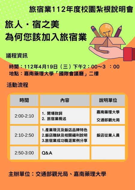 交通部觀光局於本(112)年4月19日於嘉南藥理大學辦理紮根說明會,邀請雲朗集團及凱撒集團,分享飯店品牌特色、職缺與相關福利說明及旅宿業成功職涯案例等,包括民生學院、休閒管理學院、人文學院及藥理學院均一起共襄盛舉,讓旅宿業的徵才觸角開拓更多領域,與會學生均對旅宿業前景及實務工作均有更深一層的認識。