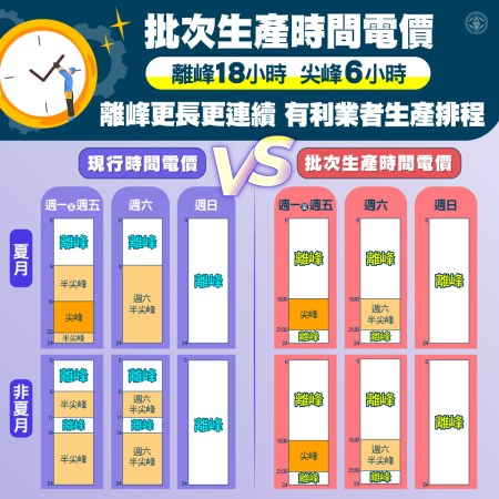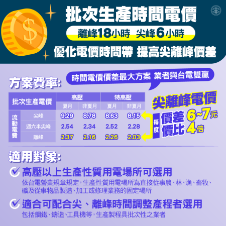 隨著再生能源發電持續增加,為鼓勵用戶能多在太陽光電充裕時段用電,台電自今(112)年起實施時間電價新時間帶,重新調整尖峰與離峰的時間,也因應不同業者的生產模式,規劃多元的時間電價方案。此次增訂「批次生產時間電價」,離峰時間長達18小時,達6~7元之尖離峰價差,以利業者利用離峰時間連續生產,方案將於1日起實施,高壓以上生產性用電約1.7萬戶可選用。