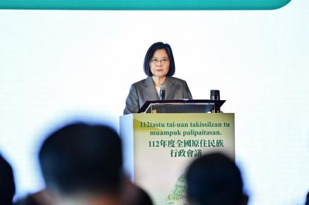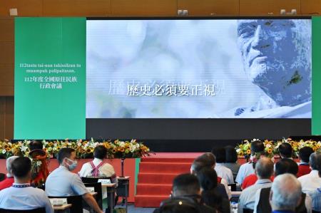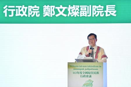 今日「112年度全國原住民族行政會議」鄭副院長陪同蔡總統入場就座後,先聆聽由高雄市立桃源國中布童凡響合唱團布農古調組曲開場表演,稍後回顧由原民會所製作7年來轉型正義推動成果影片,並與在場與會來賓大合照。隨後,副院長致詞時使用排灣、魯凱族、布農族、阿美族及泰雅族等5種族語向所有在場的原住民族朋友、來賓親切問候,獲得滿滿的掌聲,並在蔡總統結束致詞後,陪同離開會場。