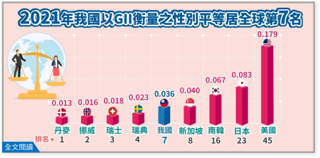 1.2021年我國GII位居全球第7名:聯合國開發計畫署(UNDP)編算之性別不平等指數(Gender Inequality Index,GII),係由生殖健康、賦權及勞動市場3個領域之5項指標衡量各國性別平等情況。2021年GII 全球排名以丹麥0.013居第1(值愈接近0代表性別愈平等),挪威0.016次之,瑞士0.018居第3名,我國依國際定義及編算方法計算後,GII值為0.036,較前次(2019年為0.045)進步,在171個國家中排名第7,居亞洲首位,優於新加坡(0.040,排名第8)、南韓(0.067,排名第16)及日本(0.083,排名第23)。