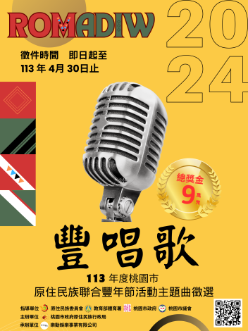 「113年度桃園市原住民族聯合豐年節活動主題曲徵選活動」活動係透過公開徵選活動方式,邀請全國各界對原住民音樂之愛好者一起創作並踴躍投稿,榮獲第1名之歌曲將作為桃園市聯合豐年節之年度主題曲。