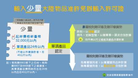 基隆關表示,依據經濟部公告「輸入少量大陸物品准許免辦輸入許可證之規定」,未准許輸入之大陸工業產品(稅則第25章至第97章,註:公告排除適用者除外),其起岸價格在新臺幣3萬2,000元以內,且單項產品在24件以內者(即24 PIECES/UNITS,不能以件數論計者,在40公斤以內)准許免證進口,但屬稅則第6802節下之石材、稅則第6907節下之瓷磚者,其單項產品需同時符合在24件以內且在40公斤以內。