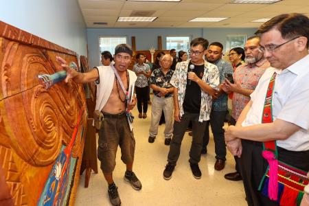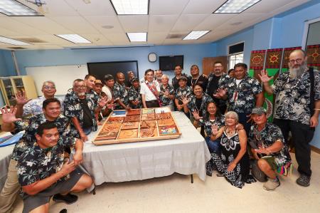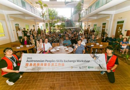 原民會於11日在美國關島大學(UOG)舉行「2023南島民族技藝交流工作坊」成果展,共18名來自9個國家的工藝師共同交流,夷將Icyang主委親自前往關島主持結訓典禮,並將各工藝師的個人創作拼接而成的大型成果作品,致贈給關島總督府。