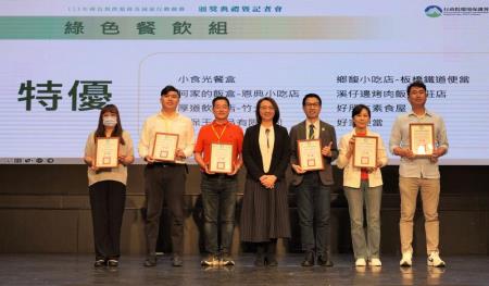 「綠色餐飲組」係以餐飲業者提供機關、學校及一般民間單位以循環容器盛裝餐食外送供餐之成效,8家特優、12家優等及9家特色獎