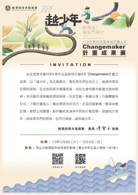 一、為展現計畫青年推動成果,定於112年12月9日至10日假臺北市華山1914文化創意產業園區中4B辦理旨揭成果展,