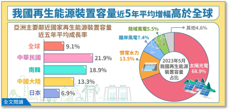 4. 我國再生能源裝置容量近5年成長幅度高於全球平均:在全球淨零碳排浪潮推動下,近年各國均加速再生能源建置,全球再生能源占總發電裝置容量比重逐年攀升,從2017年之32.1%上升至2022年之40.2%,增加8.1個百分點;同期間我國增加12.1個百分點;觀察再生能源裝置容量近5年平均年成長率,我國為21.9%,高於全球平均之9.1%,與亞洲主要鄰近國家相較,亦高於南韓(18.9%)、中國大陸(13.3%)及日本(6.9%);我國太陽光電及離岸風電裝置容量近5年平均年增40.6%及147.6%,亦高於全球平均之21.6%及27.4%。