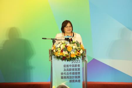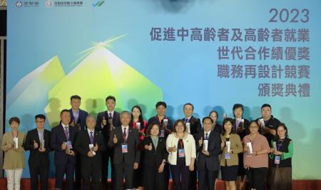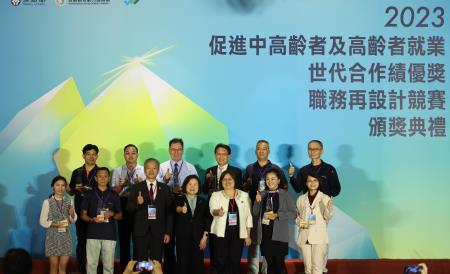 勞動部6日於台北喜來登大飯店舉行「2023促進中高齡者及高齡者就業暨世代合作績優獎、職務再設計競賽」頒獎典禮,由勞動部部長許銘春出席頒獎,肯定得獎單位及得獎者致力協助中高齡者及高齡者就業,鼓勵事業單位善用職務再設計減輕工作負擔,勉勵各界效法獲獎單位的成功作法,積極進用壯世代員工,共同建構友善就業環境。