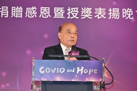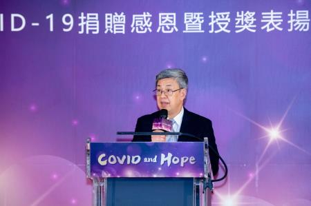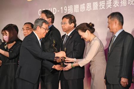 行政院長陳建仁2日晚陪同蔡英文總統出席「COVID-19捐贈感恩暨授獎表揚晚會」時表示,感謝蔡英文總統、蘇貞昌前院長、中央流行疫情指揮中心歷任指揮官、第一線防疫同仁及所有國人共同努力,一同抗疫,為臺灣締造非常亮眼的防疫成績,也讓國際社會驚豔不已,至盼未來持續發揮社會凝聚力,將臺灣打造成為一個更美好、更溫暖、更堅韌的國家。