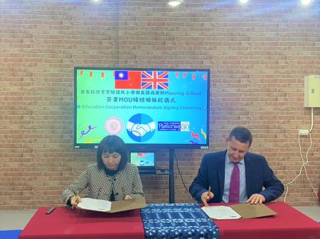 為借鏡英國威爾斯語復振、推廣經驗,客家委員會19日特別安排苗栗的僑育多元智能實驗小學與英國威爾斯的Plascrug School締結姊妹校,並在客委會副主任委員范佐銘與苗栗縣副縣長鄧桂菊的共同見證下,由僑育實小校長李雯琪與Plascrug School校長Berian Lewis進行正式簽署合作備忘錄(MOU)。范副主委希望透過臺灣與威爾斯的跨國交流,能夠與國際產生更多連結,互相討論推動母語的策略,將母語更成功地推展到下一代。