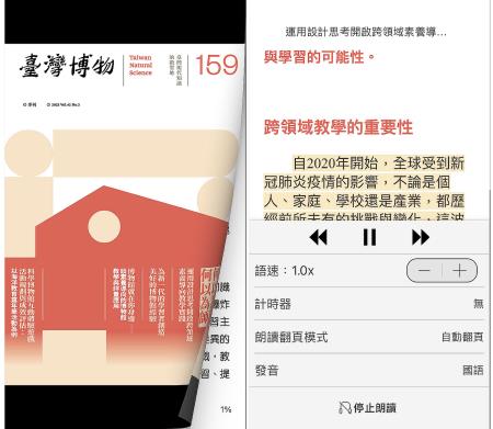 臺博館表示,推動出版品數位轉型是博物館減緩極端氣候變遷及其影響,邁向淨零碳排家園的關鍵行動。《臺灣博物》自159期起採PDF及Epub雙軌格式數位發行,不僅方便取得,讀者亦能依個人喜好抉擇。新推出的Epub服務能適應不同載具的螢幕尺寸,提供了讀者更多閱覽的便利性與流暢感,讀者亦可自行替換樣式及版面,從字體、字型、間距到背景色彩皆具調整彈性,進階使用功能則包括筆記、書籤、註釋連結、記憶閱讀進度、語音朗讀等。《活動簡訊》除了以PDF型式於官網發布,未來也將發布網頁版,提供篩選器,供觀眾自行設定生成所需的活動行事曆。
