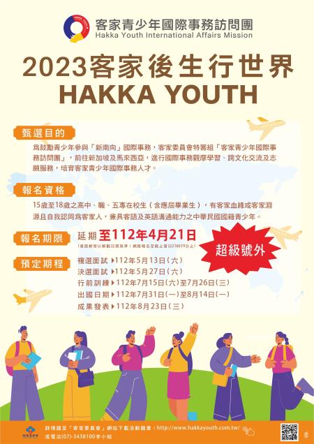 因疫情停辦三年的「客家青少年國際事務訪問團」,於今年(112)二月農曆開春後,重啟恢復辦理團員的甄選報名活動,主辦單位客家委員會為提供更多認同客家文化的學子出國參訪機會,將報名期限延至4月21日(星期五),歡迎全國15至18歲之高中、職、五專之青少年踴躍報名。