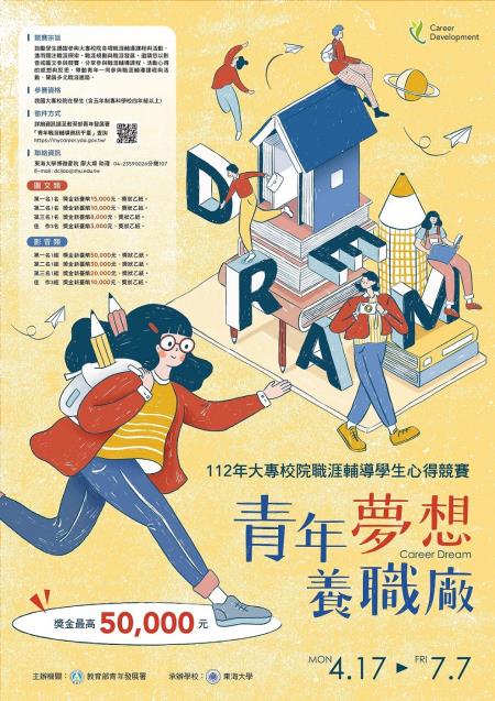 教育部青年發展署為鼓勵青年關心自我職涯發展及職涯規劃,特別辦理「大專校院職涯輔導學生心得競賽」,邀請大專校院學生記錄參與校內或跨校的職涯輔導課程或活動,發揮圖文及影音創意,藉由創作分享自我職涯發展的歷程。112年競賽報名自即日起至7月7日截止,歡迎大專校院(含五年制專科學校四年級以上)在學生踴躍報名。競賽最高獎金新臺幣五萬元,鼓勵青年一同為夢想養「職」,為理想增「職」!