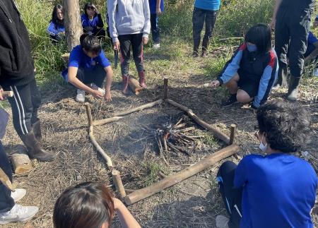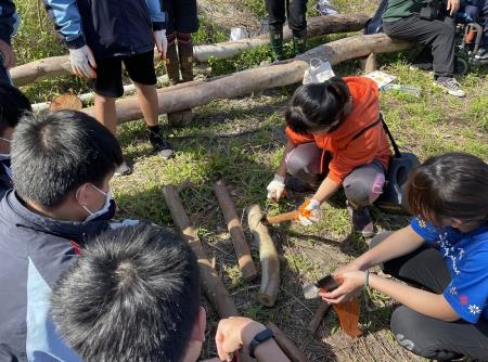 課程進一步進行開墾實作,讓學生親自走入森林學習整理木材並使用鏈鋸操作,同時探討空間設計的概念。老師提出「砍樹時應該採取何種方法來保護樹木?」問題,強調行動對生態系統的影響,要求學生謹慎思考每棵樹木間之關係,以避免意外砍伐。透過與森林的互動,學生認識到部落文化和林木建築的重要性,並從中領悟到人生智慧。戶外課程將森林連結生活,亦引入建築透視圖的概念,讓學生習得部落傳統木樁製作,與繪製透視圖學習測量、尺寸標註等建築基礎知識。