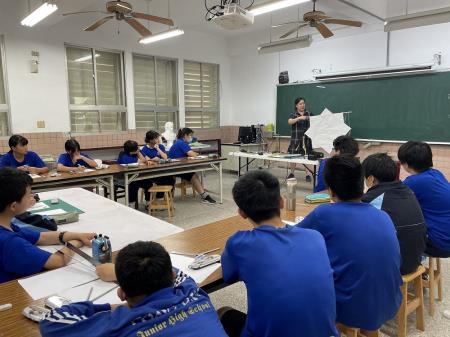 跨域課程從在地美學出發,將阿美族八角風箏文化融入數學領域課程,以風箏結構作為尺規作圖的學習情境,引導學生理解圖畫、工藝品中的對稱關係與幾何美學,引出數學美感與生活密不可分的關聯性,進而讓學生應用美感於「八角星圖騰創作」與風箏布面設計。學生們於課後反饋:將數學應用於美術創作中似乎變得不那麼困難,也更容易學習!