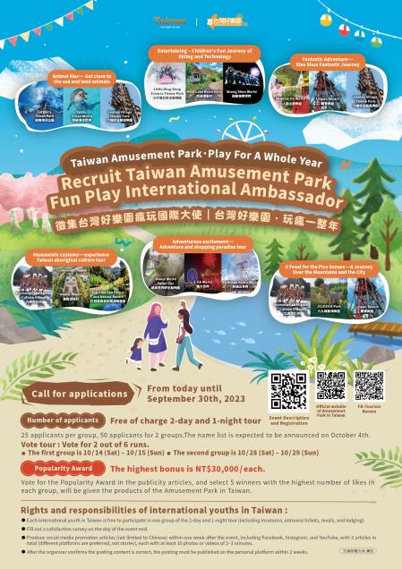 交通部觀光局與台灣觀光遊樂區協會合作推出「台灣好樂園 瘋玩國際大使」徵選活動,歡迎在臺工作、留學的外籍國際青年在9月30日前踴躍報名。活動將遴選50位國際大使,深入體驗兩天一夜、具有多元主題特色的觀光遊樂園遊程,並透過國際青年的視角與創意,向國際市場宣傳台灣好樂園的魅力,成為臺灣樂園旅遊的最佳代言人。國際大使透過社群平臺分享觀光遊樂園的旅遊相片或影片,還有機會獲得高達3萬元的人氣獎金。