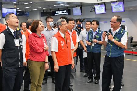 陳院長到場後,首先觀賞中部國際機場既有航廈整體改善工程影片,並聽取交通部民航局林國顯局長進行工程簡報,了解該航廈整體改善工程效益。院長致詞結束後,在民航局張瑞澍主任的解說下進行現地視察,了解國際線入境動線、發燒篩檢、行李查驗非洲豬瘟等事項,並與所有貴賓合影留念。