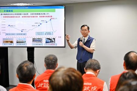 陳院長表示,臺中機場近20年前遷至現址,其後客運量快速成長,到2019年已突破280萬旅運人次,服務容量已趨於飽和,因此政府此次投入逾10億元予以改善,希望每年再增加服務近80萬人次,達到360萬旅運人次的年度目標,也期盼中央與地方共同努力,做好機場周邊相關建設,以逐步實現500萬、1,000萬旅運人次的目標。