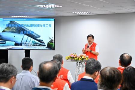 陳院長指出,臺中市擁有全球密度最高的精密機械產業聚落,零組件供應鏈相當完整,是臺灣發展航太產業的重鎮,成為許多隱形冠軍的發展基地,而臺中機場是中部空運的國際門戶,對在地產業的發展至關重要,蔡英文總統在2019年出席臺中機場航廈改善工程動土典禮時,即曾說「政府對臺中國際機場的每一分投資,都是投資中臺灣的發展、也是投資全臺灣的未來。」