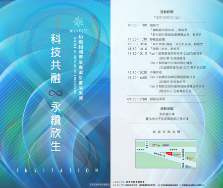紡織產業年度盛事,由經濟部產業發展署指導,工業技術研究院、紡織產業綜合研究所、中華民國紡織業拓展會及鞋類暨運動休閒科技研發中心等法人單位共同執行的「2023 FUSE紡織相關產業專案計畫成果展」,將於112年12月1日(五)假紡拓大樓17樓舉辦。本次活動將展演4場內容精彩時尚動態秀、紡織創新技術與輔導成果靜態展示與專業研討會,展現紡織產業科技、創新、活力的新亮點。