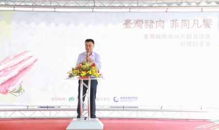 農業部部長陳吉仲11日在屏東縣主持「臺灣豬肉 菲同凡饗」臺灣豬肉外銷菲律賓封櫃記者會,與財團法人商業研究董事長許添財、屏東縣政府及冷凍肉品工會代表,共同見證臺灣在109年成為口蹄疫非疫區之後,生鮮豬肉首櫃外銷菲律賓的重大突破。陳部長表示,促進豬肉產業永續發展及維護豬農收益,是農業部非常重要的工作,而協助臺灣生鮮豬肉重返國際肉品市場,也是國家重要政策。在政府與業者共同努力下,今(112)年1月臺灣嘉一香、欣樂、和榮意、泰安、信功、台畜等6家屠宰場的生鮮豬肉取得菲律賓農業局進口核准,該部馬上在7月委託商業研究院邀請菲律賓豬肉進口商來臺訪廠,經過2個月努力與磋商,嘉一香食品有限公司與菲國業者談成40呎櫃22噸豬肉訂單,是臺灣自口蹄疫疫區除名後,首櫃生鮮豬肉出口菲律賓的成功案例。