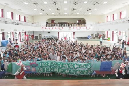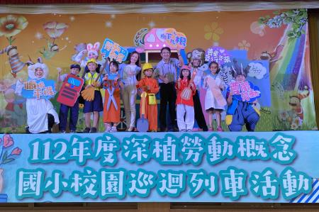 勞動部19日於台南市學甲國民小學舉辦「112年度深植勞動概念─校園巡迴列車」舞台劇活動及啟動儀式,由勞動部與陳敏男校長及扮演不同職人的小朋友共同參與啟動儀式,全場300多名小朋友與台上熱烈互動,讓演出活動熱鬧開跑。