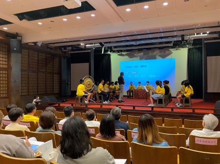 本次跨縣市交流分享會現場邀請彰化縣大城國小校長王舜儀帶領五、六年級學生分享北管學習經驗,並由北管藝師林建昌演示教學、共同演出一小段的扮仙戲;接著移地學習,邀請到青竹竹藝文化園區創辦人陳靖賦進行竹生態、竹工藝品與竹文化產業的導覽介紹,並由南投縣竹藝學會理事長劉興澤帶領體驗編製竹戒指。