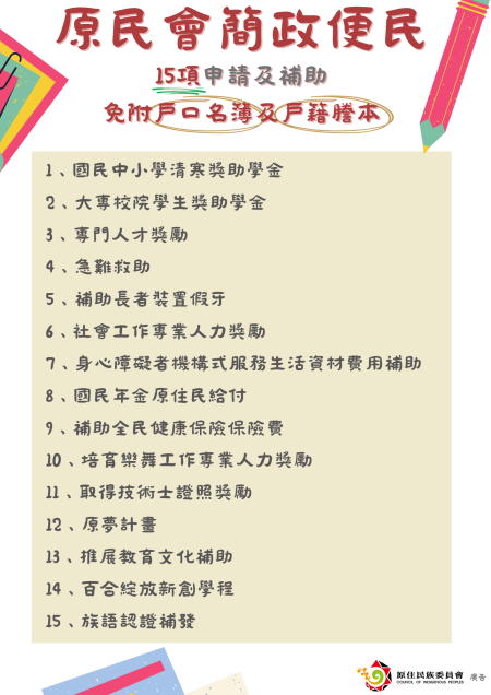 原民會指出,該會各項申請計畫案件中,計有15項計畫,包括專門人才獎勵、國民中小學清寒獎助學金申請、大專校院學生獎助學金、族語認證補發、急難救助、補助長者裝置假牙、社會工作專業人力獎勵、身心障礙者機構式服務生活資材費用補助及百合綻放新創學程計畫等,未來除了將擴大實施範圍,更將持續協調相關部會,以逐步達成族人申請政府服務全面免附戶籍資料的目標。