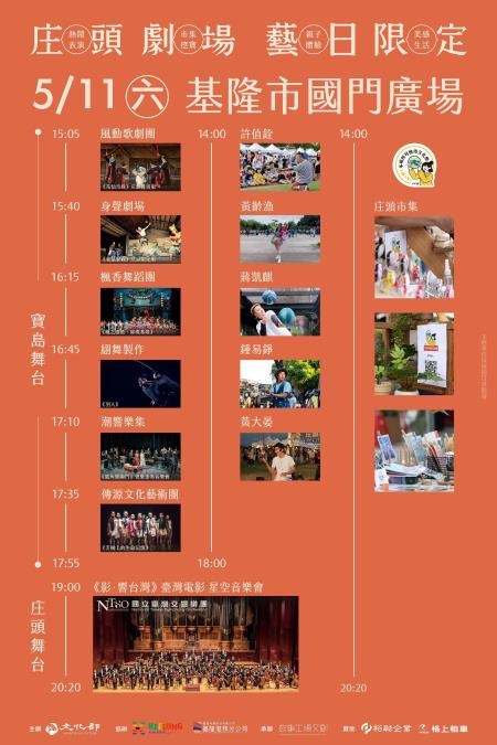 當日活動將從下午2點開始,由6個傑出表演團隊輪番上場,包括風動歌劇團演出暌違10年的兒童歌仔戲《花仙奇緣》庄頭限定版;身聲劇場具魔幻與趣味的親子劇場作品《老鼠娶親》;連續多年獲選傑出演藝團隊的楓香舞蹈團,以《楓之禮贊.璀璨基隆》演出4支不同風格的舞蹈作品;翃舞製作獻上曾獲得瑞士伯恩舞蹈平台(Tanzplattform Bern)觀眾獎的《羽人》;潮響樂集的管樂重奏表演《號角響國門》,呈現經典及流行曲目;傳源文化藝術團則以《舌根上的生命記憶》傳達泰雅族樂舞之美。