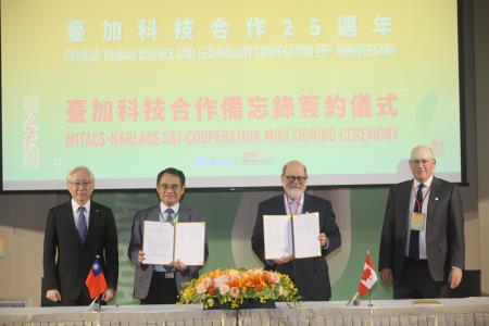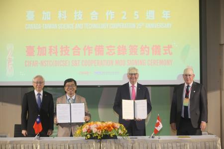 今日慶祝大會上由加拿大駐台北貿易辦事處(CTOT)與我駐加拿大代表處(TECO)代表雙方續簽臺加科技合作備忘錄;並由國科會(科教國合處)與加拿大先進研究所(CIFAR)簽署合辦下世代前沿科學論壇研討會之合作備忘錄,以及由國家實驗研究院與加拿大人才培育平台Mitacs新簽署國際產學合作備忘錄。