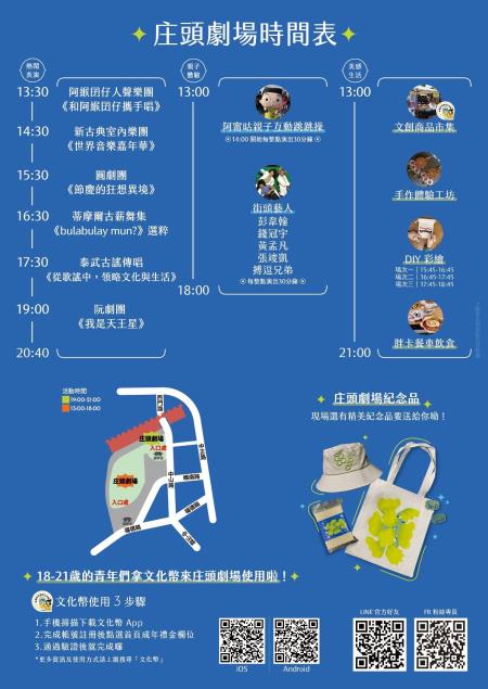文化部表示,「庄頭劇場藝日限定」文化平權巡演活動結合「熱鬧表演」、「市集挖寶」、「親子體驗」、「美感生活」四大主軸,創意市集區域內也可使用文化部為青年民眾所推出的「文化幣」。希望讓更多人感受到文化的魔力,並對臺灣藝術和表演藝術產生更多的熱愛和支持。最新演出資訊及活動花絮,歡迎至臉書專頁(https://www.facebook.com/equitymoc)查詢。
