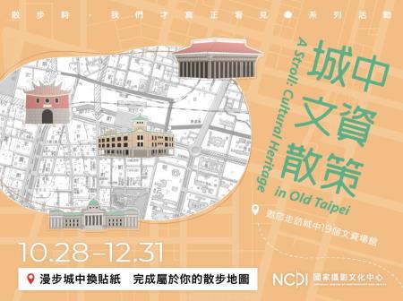 國家攝影文化中心臺北館,鄰近臺北火車站且位處交通轉運樞紐,往來的人潮總是匆匆走過,鮮少有人願意停下腳步,駐足認識城中一帶見證臺北發展、充滿故事的街廓中豐富且眾多的歷史古蹟。為此國家攝影文化中心推出「城中文資散策」地圖文宣,邀請大家跟著地圖,放慢腳步,走訪國家攝影文化中心臺北館周邊的特色古蹟建築,探索豐富且精彩的故事,感受深厚的文化底蘊,還可以參加活動,兌換這些文資場館的Q版貼紙!