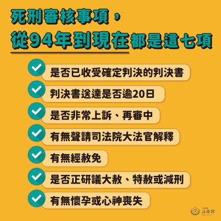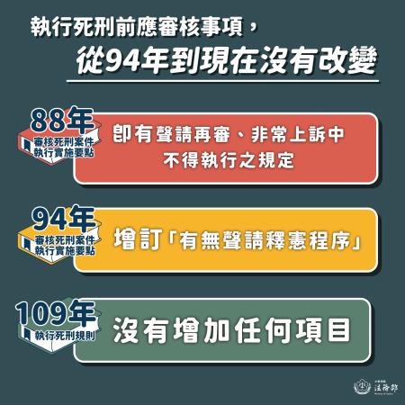 換言之,109年「執行死刑規則」所訂7款審核事項,皆係源自94年「審核死刑案件執行實施要點」之規定,原封不動移列,並非109年修正「執行死刑規則」所新增。