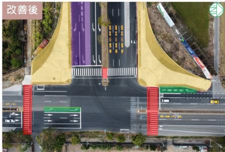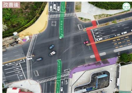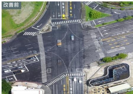 最後到新市區西拉雅大道、台19甲線路口看人行車行改善情形,原路口行穿線轉折不連續,轉彎時易造成人車衝突、右轉車道無人行庇護、行人與自行車道穿越寬度不足,容易產生交織等。經過增設行人庇護島、行穿線位置重新規劃、將北側北往南右轉車道封閉並擴大街角,提供行人安全停留空間並將左轉車道延伸,增加儲車空間,讓直行與轉彎分流,避免左轉車與對向直行車碰撞,以減少事故的發生。
