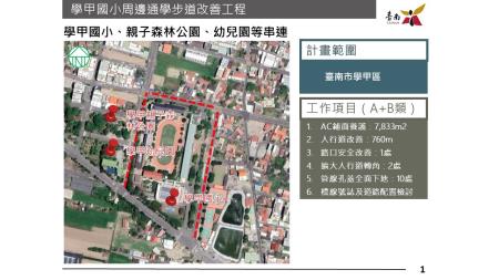 學甲區學甲國小已爭取內政部營建署所推動之補助申請,為瞭解規劃情形及問題,視導小組至學甲國小實地勘查,因現況周邊人行道無串連不連續,南側人行道現況老舊且坡度不順,影響行人通行安全,未來將重新規劃路口與周邊通行空間,包含人行道改善、路口轉角人行道擴大,經委員現場勘查後,建議應再納入周邊學甲幼稚園與親子森林公園,以完善整體區塊人行環境及公共設施串聯,強化學區人行安全。