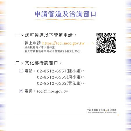 文創法投資抵減暨租稅優惠服務網:https://tcci.moc.gov.tw/