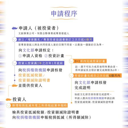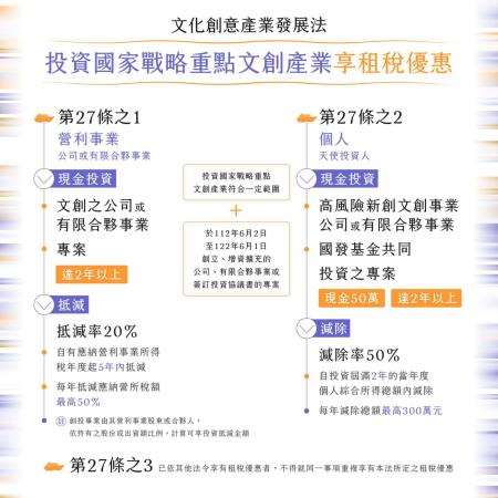 文化部指出,公司、有限合夥事業以現金投資行政院核定的國家戰略重點文化創意產業文創公司或有限合夥事業、專案,並達2年以上,可在投資額20%以內,自有應納營所稅年度起5年內,每年最高抵減所得稅額總額50%;個人投資高風險新創公司或有限合夥事業,以及由國發基金共同投資的專案,現金投資50萬元,並達2年以上,可在投資額50%以內,自持有屆滿2年的當年度個人綜合所得總額內減除最多300萬元。