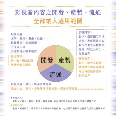 文化部今公布目前經行政院核定的國家戰略重點文創產業,包括影視內容產業及聲音內容產業的開發、產製、流通。適用投資抵減的一定範圍則包含影視內容產業文字、圖像、漫畫、動畫、視覺藝術、表演藝術、沉浸式內容及遊戲等故事開發,並導入劇本創作;影視內容的製作;攝影棚與片場、專供影視內容製作使用的科技技術應用(包括特效)等、演員培育;影視內容發行、國片播映等。聲音內容產業方面,從詞、曲、編曲及聲音節目Podcast的創作;聲音內容的製作;錄音室、專供聲音內容製作使用科技技術應用、歌手培育、聲音內容的發行、演唱會,以及劇場、live house等展演空間等。