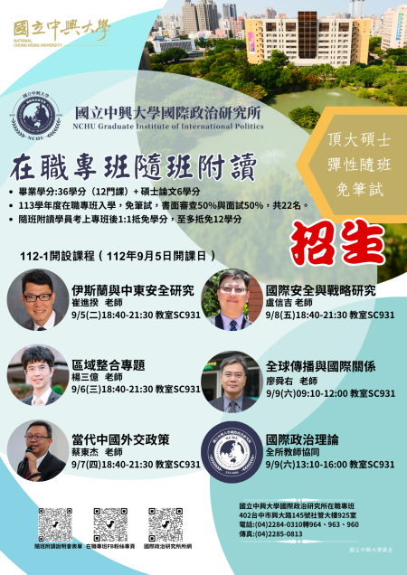 國立中興大學國際政治研究所在職專班隨班附讀招生訊息,